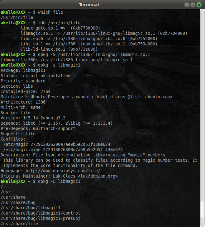 Он скажет что она была инсталирована из пакета libmagic1 для платформы intel 386. Спросим теперь что это за зверь?