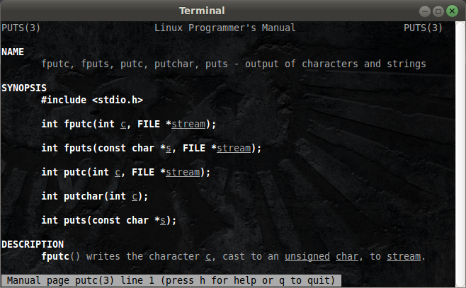 Но откуда нам знать что делают те или иные функции? Очень просто- почитать встроенную справку. Например мы видели функцию putc, почитаем справку про нее: