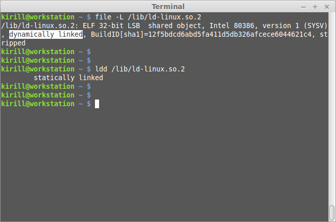 Вот вам ответ как она загружается- она не зависит от других библиотек и загружается сама сразу. Один ньюанс — раз команда file говорит что /lib/ld-linux.so.2 динамически слинкована, а ldd говорит что статически, значит кто-то из них врет. Скорее всего врет file, т.к. она строит предположения на основе сигнатур, а ldd четко проверяет зависимости.