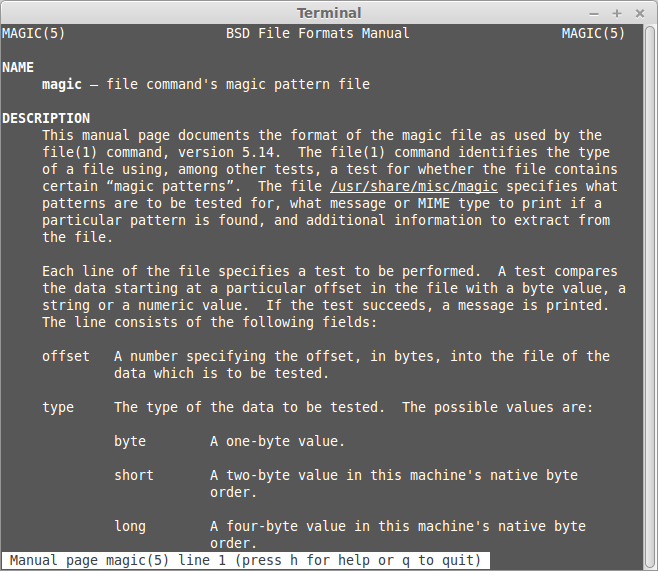 Тут сама библиотека, каталоги, отладочная информация и справочные руководства man! ( Страница 5: /usr/share/man/man5/magic.5.gz) — значит мы можем почитать описание этой библиотеки: