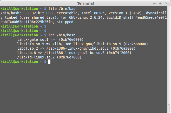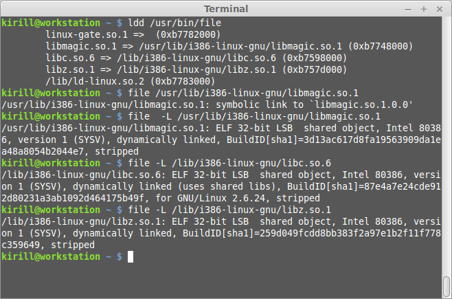 6. ldd — просмотрщик зависимостей запускаемой программы от различных разделяемых библиотек. Например, библиотеки от которых зависит программа file, т.е. кирпичики, которые начинают цепляться один за другой при запуске основной программы, т.е. программа file запускаться и работать вообще не сможет