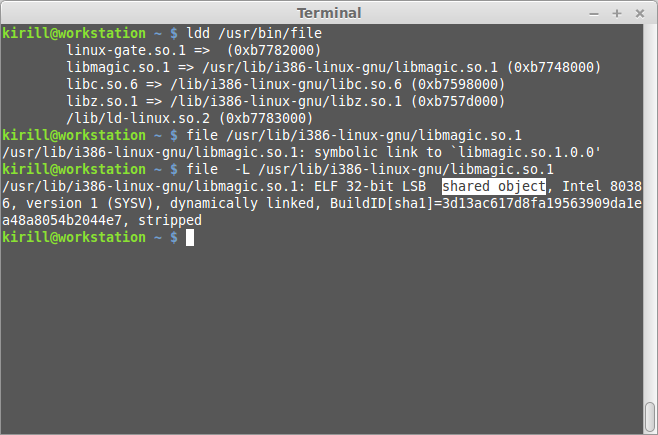Он показывает нам, что это тоже бинарный файл, формата ELF и т.д. и т.п. Только в отличие от программы ( смотрим пример для самой программы file), библиотека является не executable объектом, а shared object (выделил на скриншоте). Что это означает? — Запустить программу можно, а вот библиотеку — нет. В ней нет точки входа/старта. И если мы посмотрим остальные библиотеки, увидим такую же картину.