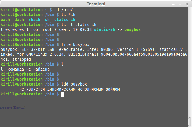 И увидим что он так же имеет зависимости. Но как же так? Ведь мы не сможем без переинсталяции починить систему в случае такого краха. Нет, сможем. Потому что в каталоге /bin лежит версия интерпретатора sh, статически скомпилированная. Она называется static-sh. На самом деле это символическая ссылка на другой инструмент — busybox — эдакий швейцарский нож. В нем реализовано много других программ, необходимых для починки ОС.