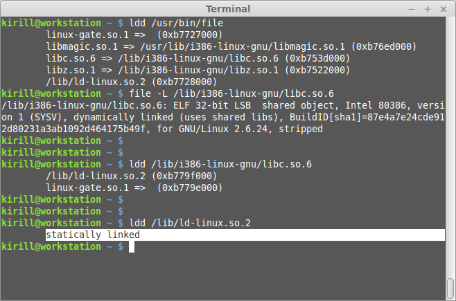 И у всех у них в свою очередь тоже есть зависимости, потому что между программой и библиотекой от которой она зависит, нет почти никакой разницы. Посмотрим ldd для библиотеки С — она в свою очередь зависит от другой библиотеки, а вот у нее уже уже нет никаких зависимостей, т.к. она статически слинкована — т.е. все что необходимо для нее, уже входит в ее состав. Т.е. она не зависит ни от каких других библиотек и может быть использована напрямую.