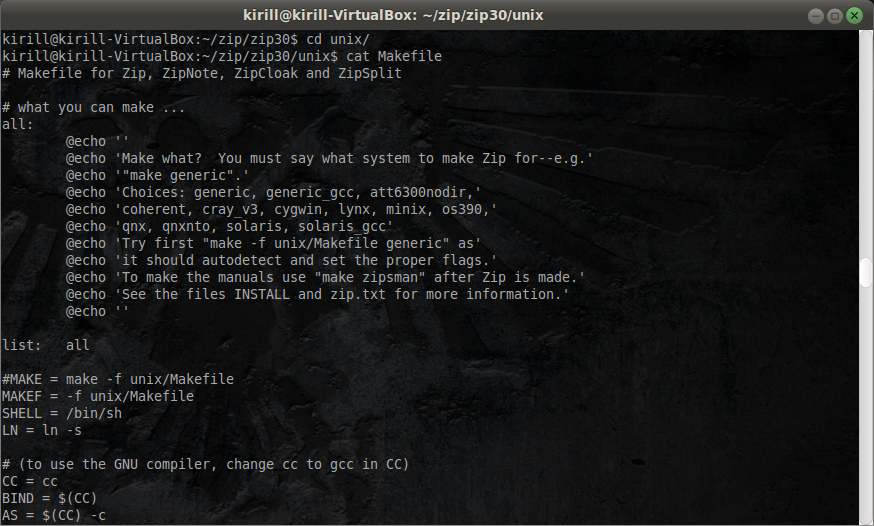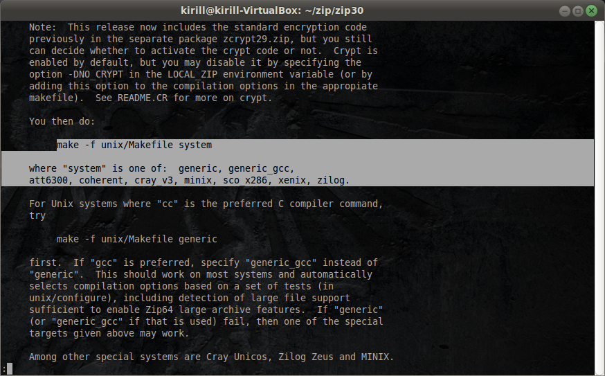 Что мы видим в справочном файлу INSTALL ( скриншот выше) — вы мол почитайте, а потом надо запустить команду make, указав ключом -f ей на файл unix/makefile и целью сборки необходимо указать систему — generic, minix, xenix, либо что нибудь еще. Варианта Linux мы тут не видим, поэтому читаем дальше и видим, что если в системе присутствует компилятор *сс, то выбираем вариант generic. Если есть gcc то generic_gcc.