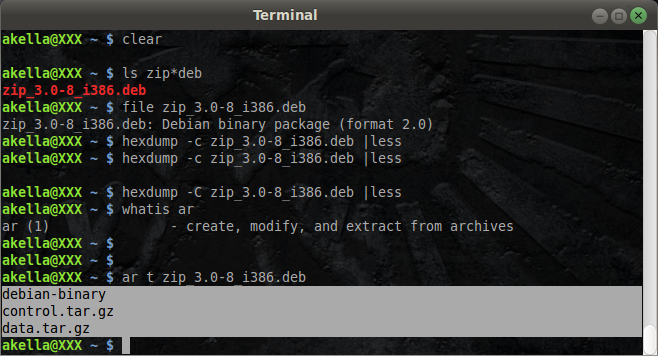 Видим что это якобы бинарный пакет Debian, однако на самом деле ( что не очень очевидно), это архив, который сжат архиватором ar. Древним архиватором ar-archiver. Кстати в Linux системах важно не путать архиваторы и компрессоры, потому что zip,gzip — компрессоры а ar, tar — архиваторы. Архиватор это процесс сборки большого числа файлов в один а компрессия — процесс сжатия файла за счет за кодирования повторяющихся участков, замены их например на ссылки с числом этих участков( на саом деле существует много достаточно сложных и разнообразных алгоритмов сжатия).
