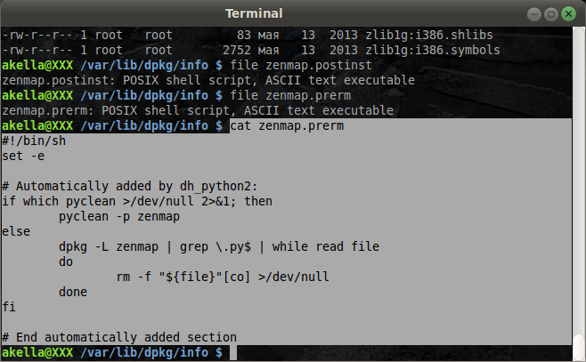Перейдем теперь в каталог /var/lib/dpkg/info/, где находится информация по всем инсталлированным в систему пакетам — сохраненные на будущее списки инсталлированных файлов ( суффикс .list) из пакетов, списки контрольных сумм из пакета (суффикс .md5sums) и инструкции по пред удалению и пост инсталляции (.postinst, .prerm)