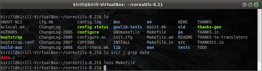 Почему так странно описываем? Потому что по умолчанию make не найдет просто утилиту date, а если внимательно посмотрим по окружающим нас каталогам, то увидим каталог src а в нем файл для date.