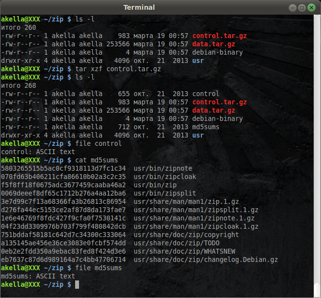 Распакуем содержимое сжатого архива control. На выходе получим файл control и md5sum. Оба представляют из себя текстовые ascii файлы как видим, причем второй- содержит контрольные суммы устанавливаемых компонентов. А что же нам говорит сам файл control?