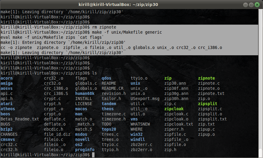 Так, вот — видим что у нас появился искомый файл zip. Запускаем его, указывая явно: ./zip, иначе система пойдет искать его среди указанных в переменной окружения PATH местах и найдет стандартный системный а не наш zip.