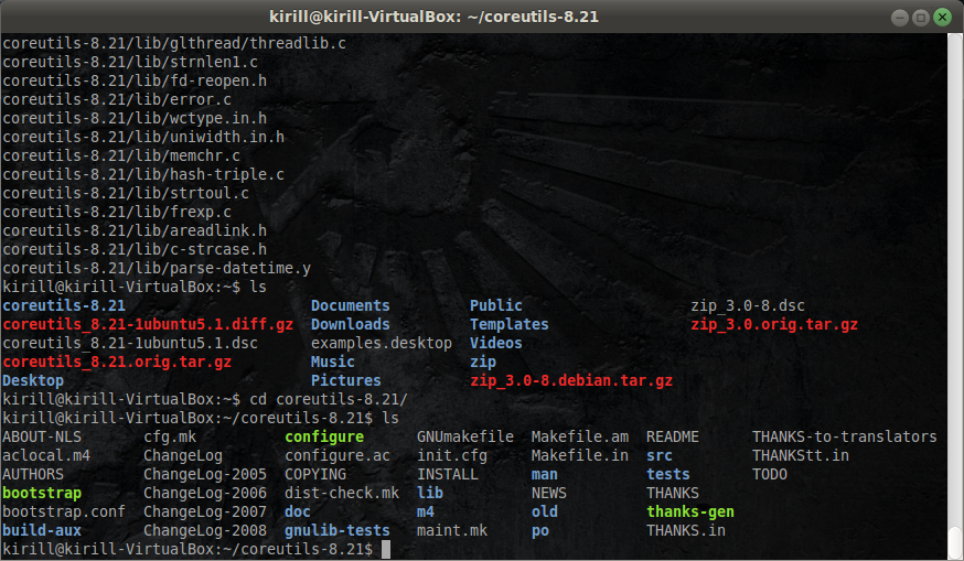 В результату у нас есть пакет и мы постараемся руками собрать из него небольшой кусочек- одну утилитку date. Для этого вначале раскроем архив исходных текстов с помощью архиватора tar: tar xvzf coreutils…..